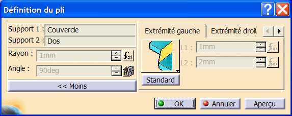 A partir de l'arête Y=0, définissez une plaque sur arête avec les paramètres de la Figure 2, attention de définir les 2 limites avec la valeur de -1mm, en observant l'incidence de ceci sur le modèle. Ne pas oublier de cocher l'option de création du pli.